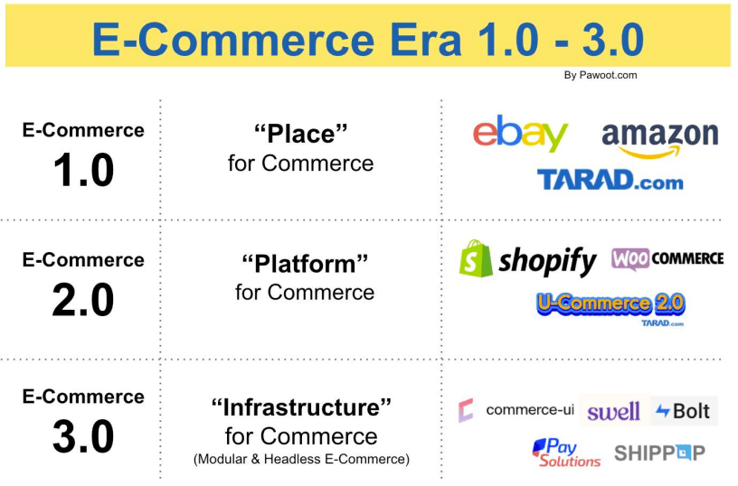 3.e-Commerce 3.0 มี infrastructure ที่ช่วยประกอบสร้างให้เกิดการขายของ บริการในยุคนี้จะเป็นชิ้น ๆ เป็น module ที่นำมาประกอบเข้าด้วยกัน เช่น Commerce-UI, Bolt, PaySolutions, Shippop