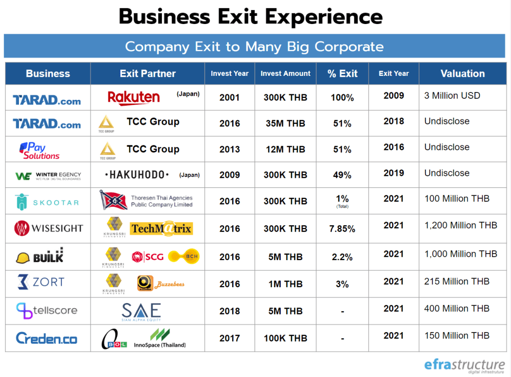 อีกทั้งยังมีประสบการณ์จริงจากการเป็นกรรมการนำพาบริษัทเข้าตลาดหลักทรัพย์มาแล้ว และยังเป็นคนที่เข้าใจธุรกิจ Startup อย่างแท้จริง (เพราะผ่านมาเอาจริงๆ หลายๆ บริษัท) ได้มีการลงทุน และพลักดันให้ Startup เติบโต เริ่มจากศูนย์ จนมียอดขายหลายร้อยล้านบาท และเตรียมตัวเข้าตลาดหลักทรัยพ์หลายๆ บริษัท มีแนวทางในการพลักดันให้บริษัทที่เข้าไปลงทุนเติบโตอย่างก้าวกระโดด ด้วยกลยุทธ์และวิธีการต่างๆ จากประสบการณ์จริง